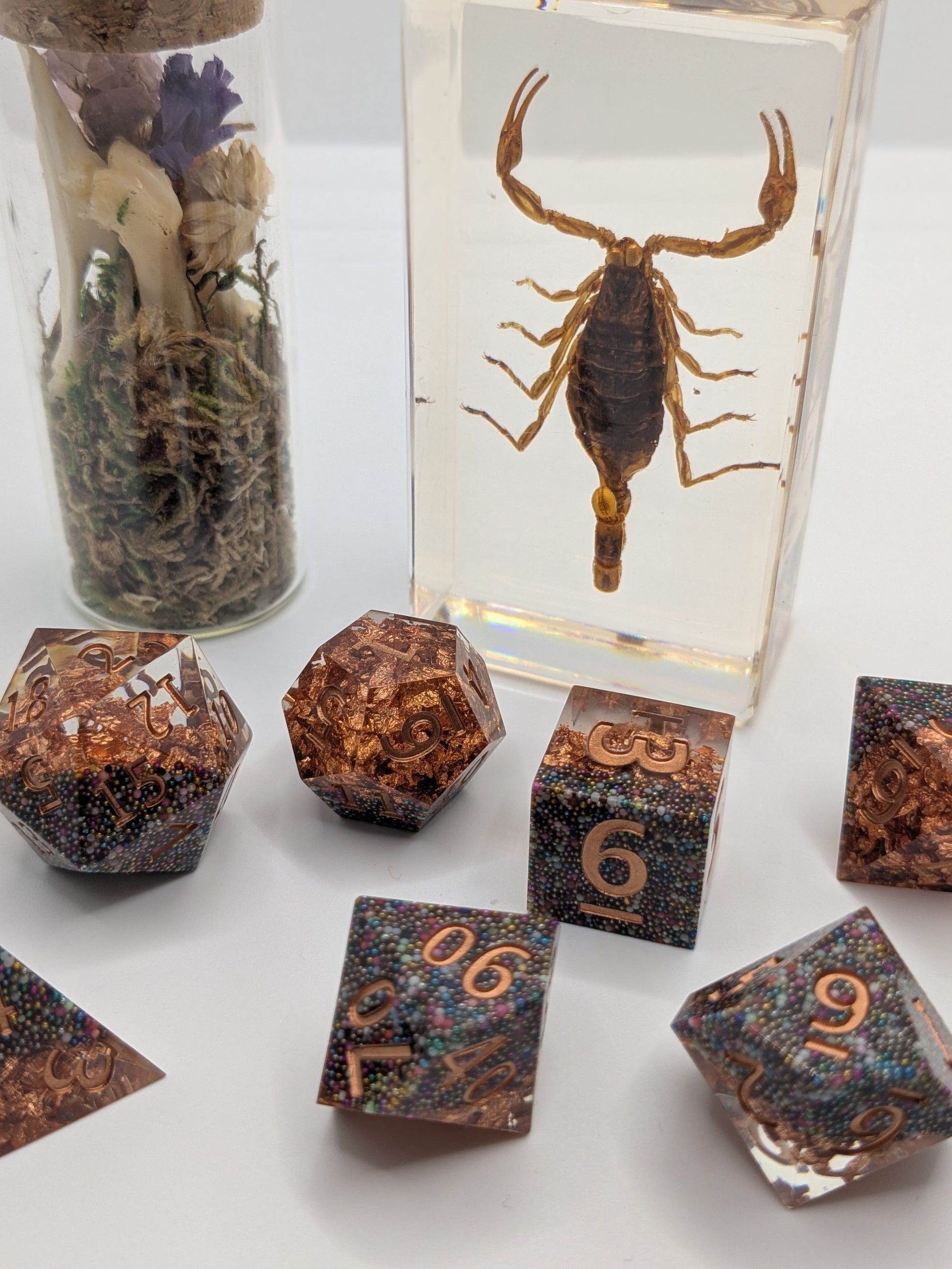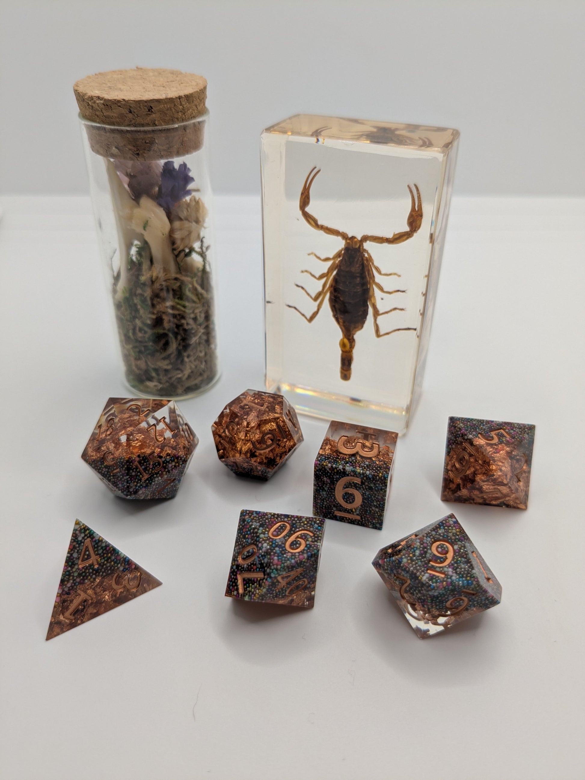 Many of the dice in our sets are resin and contain foil , glitter and for our specialty dice sets , little objects inside.
