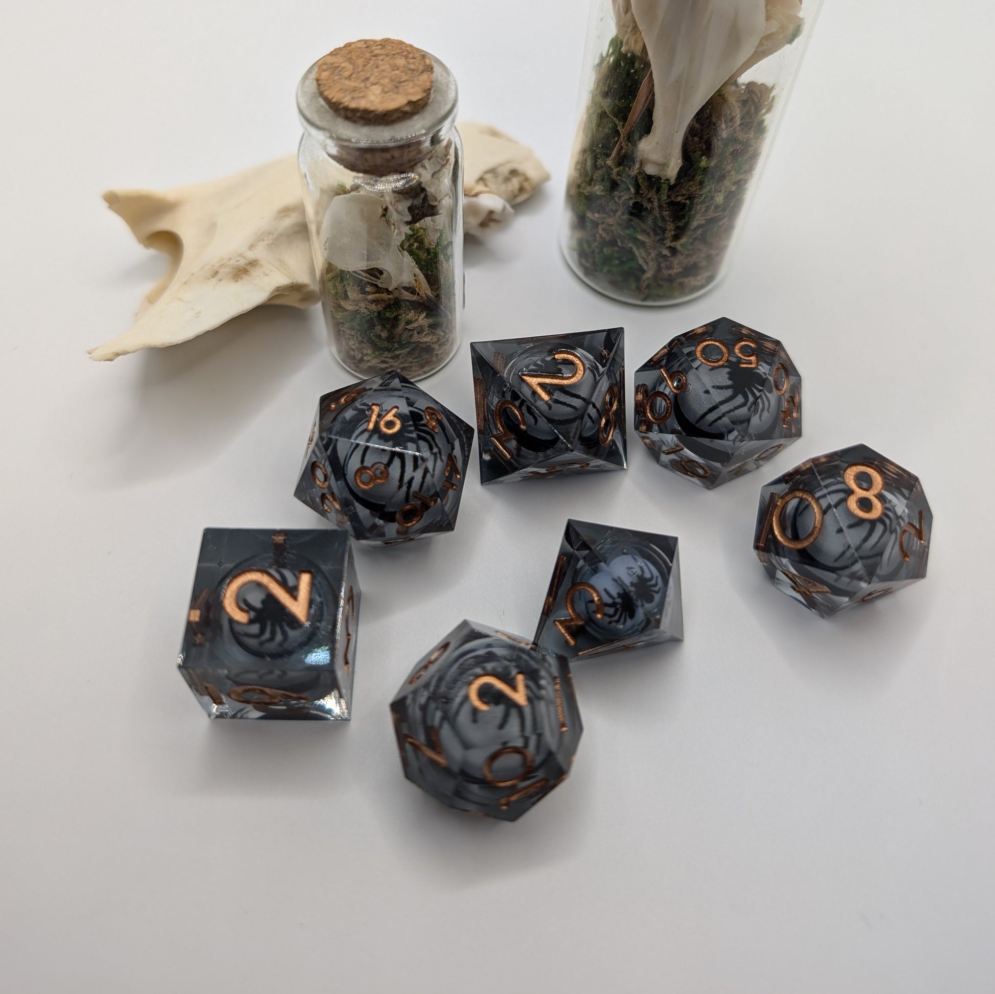 Get into the spooky spirit with our final release for the 2024 Halloween season! These dice feature a liquid core center with black spiders to spook up any tabletop session ,all year round!